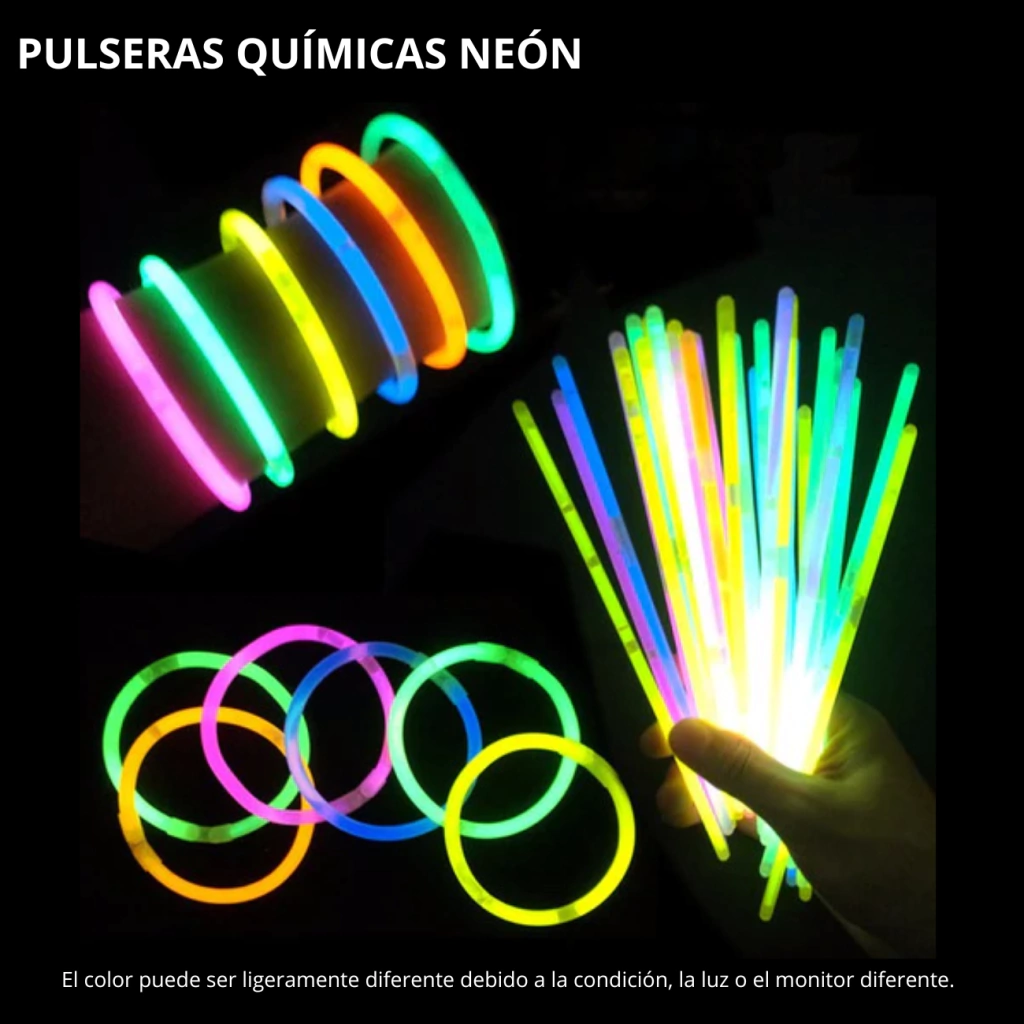 • 50 Pulseras NEÓN - Colores surtidos como naranja, amarillo, verde y más. Brillan al armarlas gracias a su luz interna. Una explosión de color que ilumina cada movimiento.