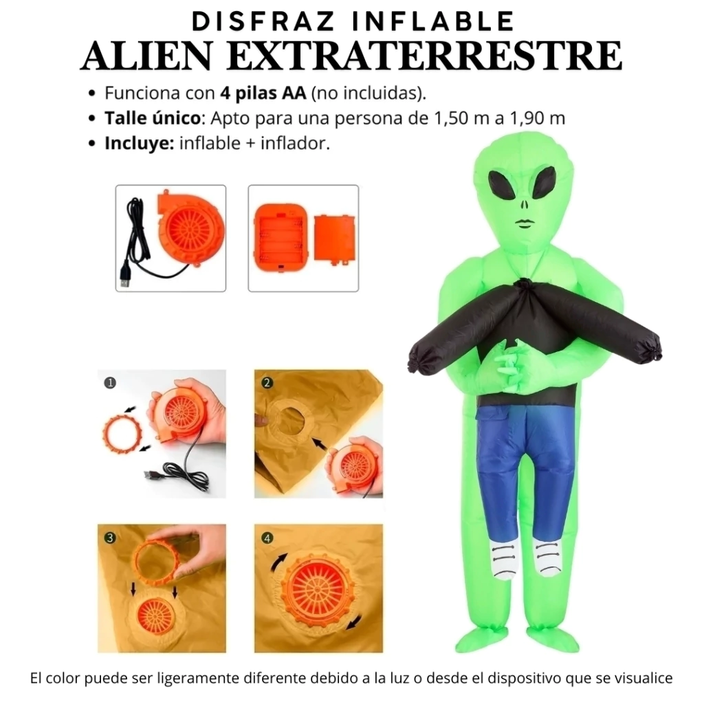 Funciona con 4 pilas AA (no incluidas), manteniendo el disfraz inflado gracias a su práctico ventilador portátil que se instala fácilmente (podés ver su fácil instalación en las imágenes de la publicación).