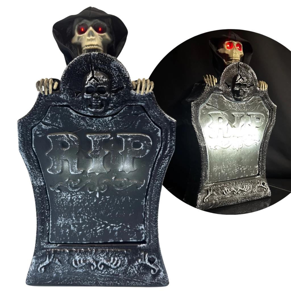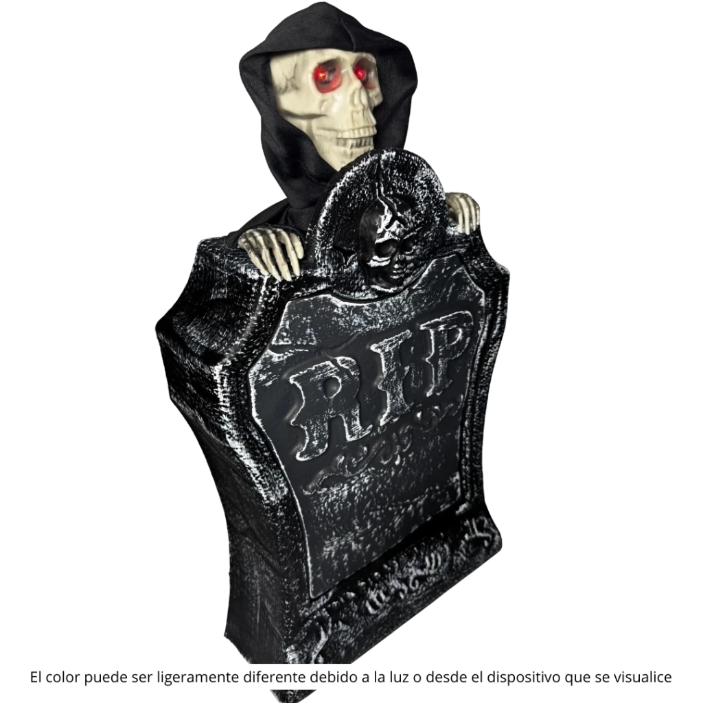 Lápida de plástico ultrarresistente, decorada con un esqueleto travieso que se mueve hacia arriba y hacia abajo, imitando un ascensor aterrador. Sus ojos brillan con LEDs rojos y la inscripción "RIP" resplandece en un blanco deslumbrante, mientras emite frases escalofriantes que seguramente te pondrán la piel de gallina. ¡Ideal para asustar a tus vecinos!